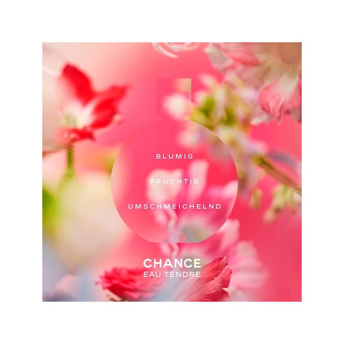 Chance Eau Tendre von Chanel ist ein zarter, femininer Duft voller Frische, Leichtigkeit und Eleganz. Die Kopfnote aus spritziger Grapefruit und fruchtiger Quitte eröffnet lebendig, frisch und fröhlich – ein Auftakt, der sofort gute Laune verbreitet und die Persönlichkeit der Trägerin strahlend unterstreicht. Im Herzen entfaltet sich ein sanftes, blumiges Bouquet aus Jasmin und Hyazinthe. Diese Herznote wirkt elegant, weich und feminin, sie hüllt die Haut in Wärme und verleiht dem Duft Tiefe, Harmonie und Charme. Das florale Herz macht Chance Eau Tendre zu einem Ausdruck von Sanftheit und zeitloser Weiblichkeit. Die Basisnote rundet das Eau de Parfum mit Zedernholz, Iris und Moschus ab. Sie sorgt für einen langanhaltenden, eleganten Nachhall, der die frischen und floralen Noten harmonisch ergänzt. Chance Eau Tendre bleibt präsent, sanft und unvergesslich.