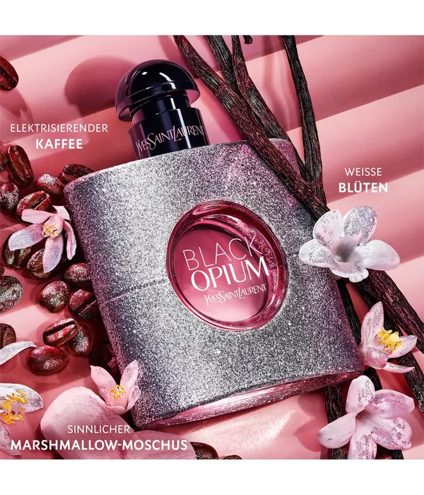 Eine unwiderstehliche Versuchung: BLACK OPIUM Eau de Parfum Glitter von Yves Saint Laurent Beauté. Der sinnliche Duft betört mit einem aufregenden Kontrast: Ein belebender Kaffee-Akkord verschmilzt mit dem sinnlichen Marshmallow-Moschus zu einer unwiderstehlichen Duftkomposition. Der exklusive, glitzernde Flakon erinnert an ein silbernes Couture-Kleid – genauso glamourös wie der Duft selbst. Das Parfum selbst enthält und versprüht keine Glitzerpartikel.