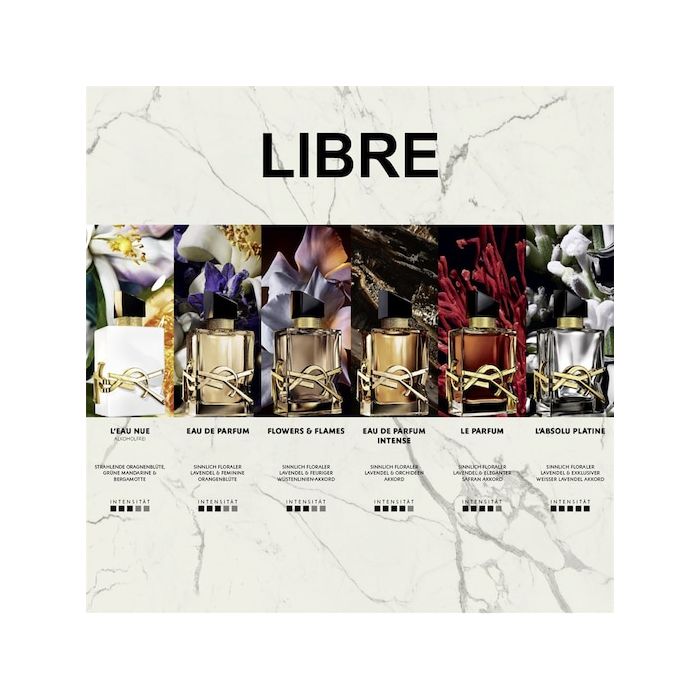 Libre von Yves Saint Laurent ist ein intensiver, selbstbewusster Duft voller Freiheit, Eleganz und moderner Weiblichkeit. Die Kopfnote aus aromatischem Lavendel und spritziger Mandarine eröffnet frisch, leuchtend und energiegeladen – ein Auftakt, der sofort Präsenz zeigt und die Persönlichkeit der Trägerin unterstreicht. Im Herzen entfaltet sich ein florales Bouquet aus Orangenblüte und Jasmin. Diese Herznote wirkt feminin, sinnlich und elegant, sie umhüllt die Haut mit Wärme und verleiht dem Duft Tiefe, Ausdruckskraft und Charme. Das Herz macht Libre zu einem Duft voller Stärke und Stil. Die Basisnote rundet das Eau de Parfum mit Vanille, Moschus und Ambergris ab. Sie sorgt für einen langanhaltenden, intensiven Nachhall, der die frischen und floralen Noten harmonisch ergänzt. Libre bleibt präsent, kraftvoll und unvergesslich.